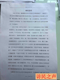 曹文兰的材料显示,2010年底,扬州市邗江区槐泗镇政府在没有拆迁手续的情况下,对曹文兰老家包家村曹庄组进行拆迁。2011年正月初八上午,十几个自称拆迁公司的人找到曹父谈拆迁问题,提出只给曹父一套房,曹父给拆迁公司26万元差价,曹父不同意这样的方案,被煽耳光、踢踹,威逼他签字。
