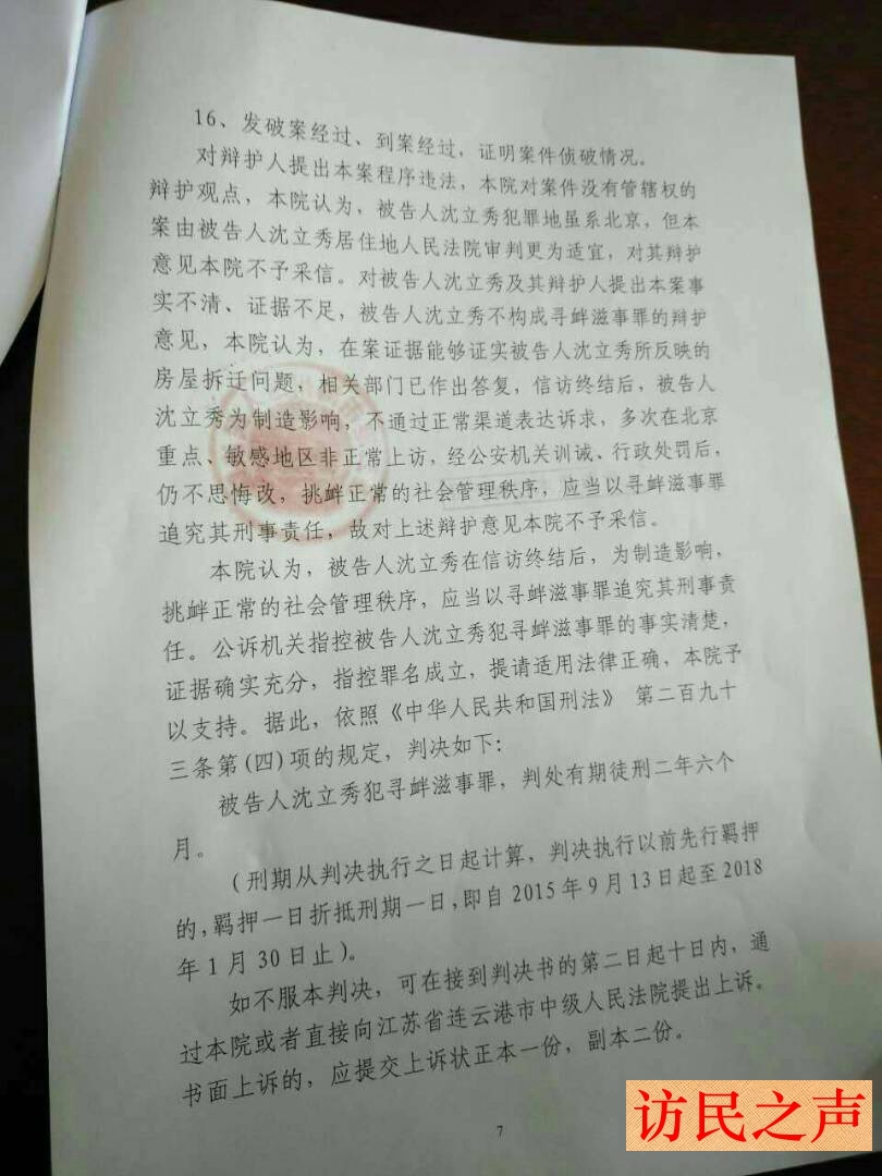 海州区法院判决书中载明,沈立秀是因信访案件终结后仍然滞留北京,不通过正常渠道反映诉求,为制造影响到重点部位,敏感地区非正常上访,并张打横幅拍照后上传到境外博讯网上。经公安机关训诫,行政处罚后仍不思悔改,挑衅正常的社会管理秩序,应以寻衅滋事罪追究其刑事责任。刑期至 2018年1月30日止,现羁押于连云港市看守所。