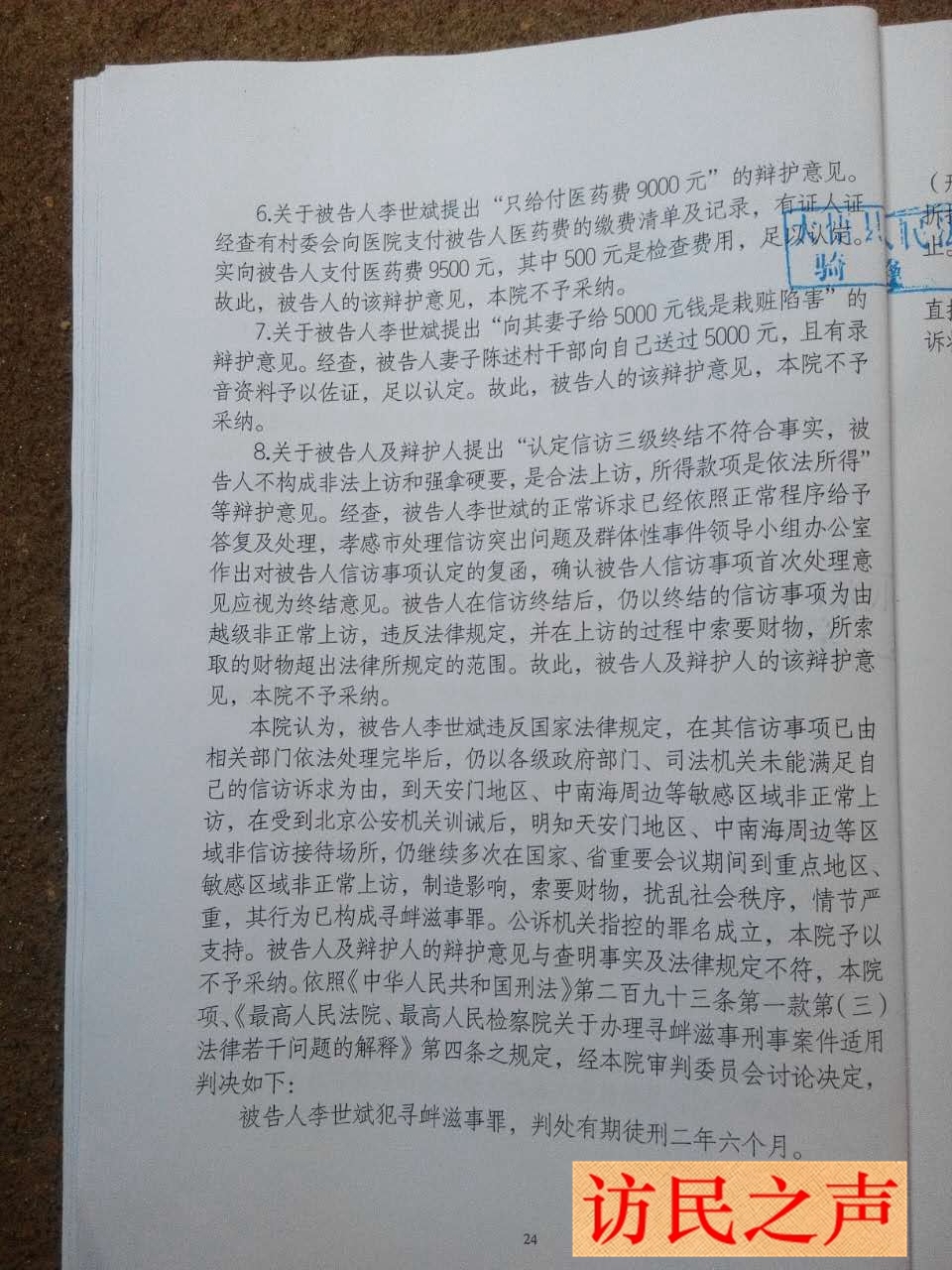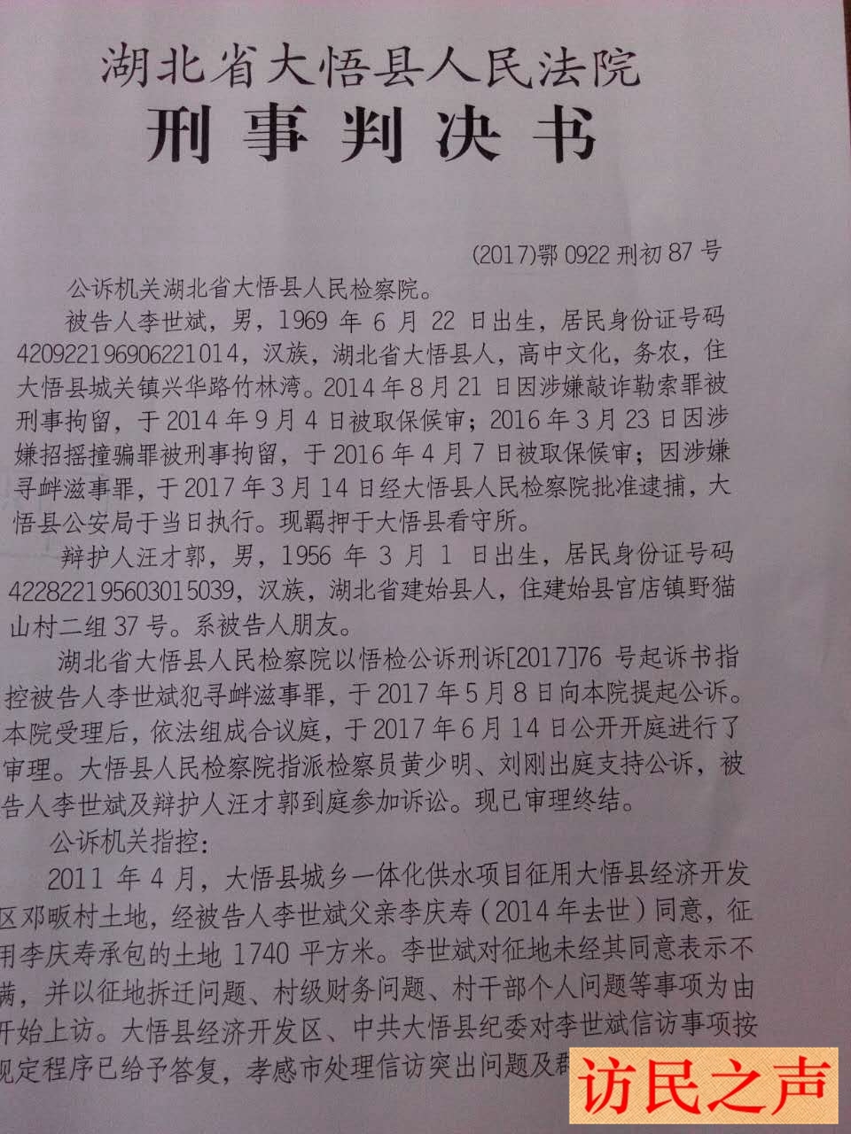 [访民之声2017/7/10消息] 今天,湖北省大悟县访民李世斌家属拿到判决书,李世斌被大悟县法院一审以寻衅滋事罪判处有期徒刑两年六个月,李世斌不服判决决定上诉。