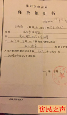 [访民之声2017/8/18消息] 被辽宁省沈阳市公安局以涉嫌“扰乱国家机关秩序罪”刑事拘留的80多岁老访民王致敬,昨日获取保候审释放。