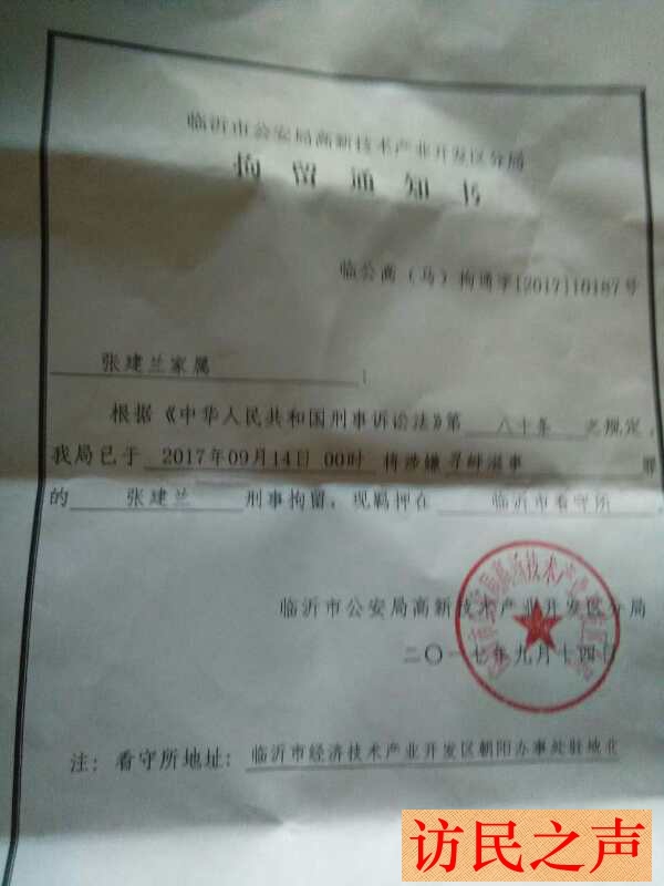 临沂市公安局高新区技术产业开发区分局9月14日出具的拘留通知书中显示,将张建兰以涉嫌寻衅滋事罪刑事拘留,羁押在临沂市看守所。张建兰的亲属表示,张建兰的母亲李希军也被刑拘,和张建兰关押在一个看守所。但警方没给母亲的拘留通知书。