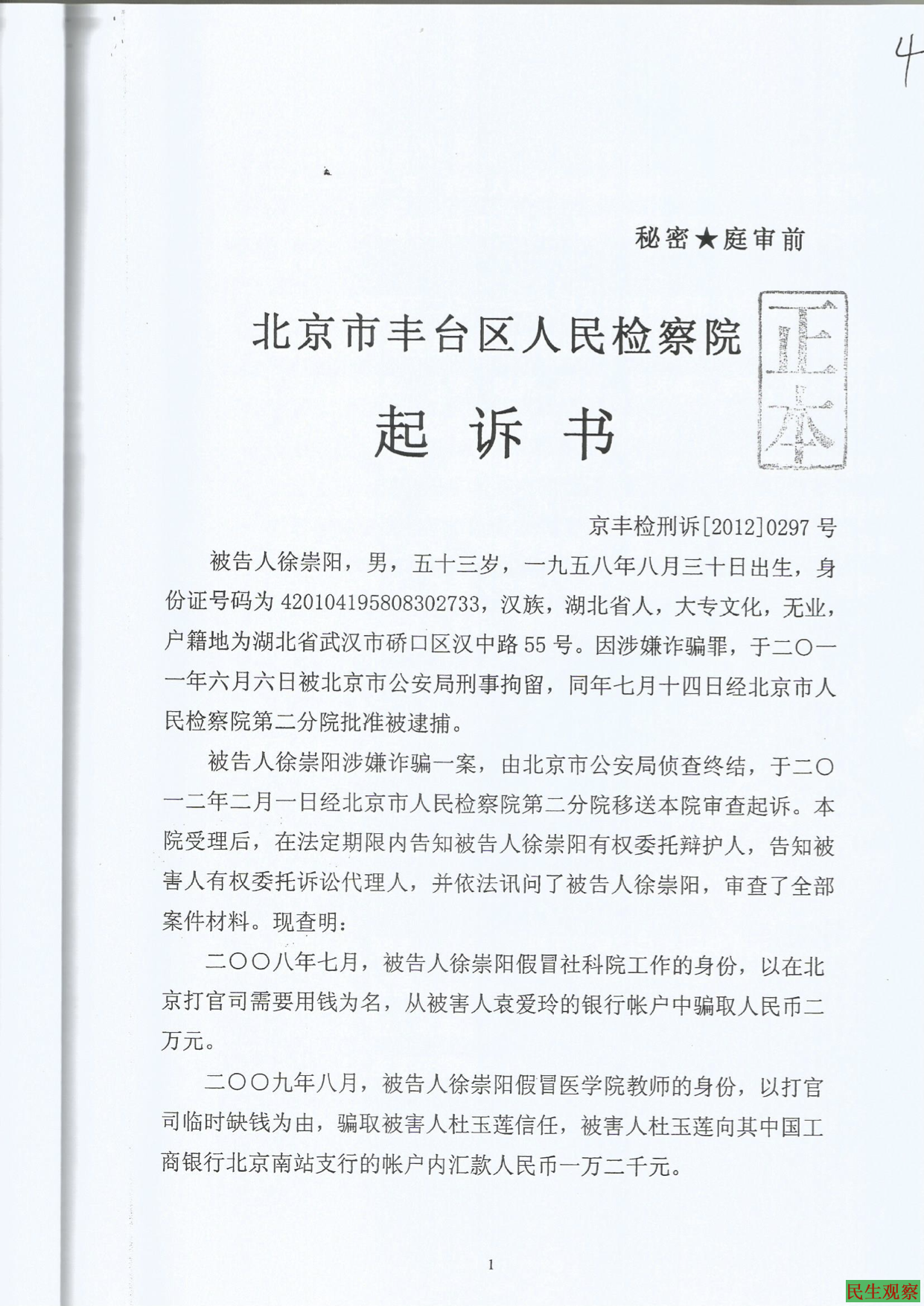 2011年4月20-23号,徐崇阳借住在北京市海淀区中国政法大学研究生院教授住宿楼2楼一房间内。这时房门被北京市公安局刑警总队重案大队李楠、王欣、李大队长、朱赤军(北京市公安局预审总队警察处长)、张翔、张雄、李喆、洪梅、熊义德(武汉市硚口区法院执行局局长)、法官夏长江、郭巍(武汉市江汉区法院法官)、武汉市公安局多个警员二十多人用技术手段打开我的家门,在无任何法律手续的情况下,拿走我家中打官司的证据和面值人民币七十多万元的邮票以及集邮的邮票,同时将徐崇阳戴黑头套带到北京市公安局刑警总队重案大队进行酷刑。