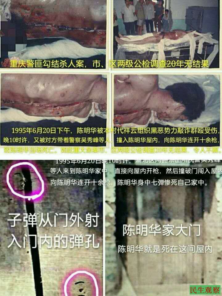 死者陈明华,1966年生 ,重庆市渝北区两路镇花石村5社村民,1995年6月20日晚约22点多遭警察枪击死亡,时年陈明华29岁,儿子陈鑫4岁。