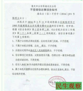 陈明玉为哥哥之死要求追责,从1996年开始走上控告和上访之路,其艰辛和劳民伤财的付出可谓十分惨重,二十多年仅是索要渝北检察院一纸不予立案的书面答复都没有成功,渝北检察院为何只给口头答复而坚决不给书面答复,显然是奉旨行事既要袒护渝北分局的错误而又不落把柄。