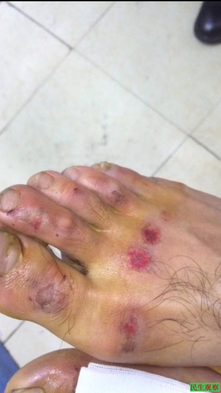 上图是王怡牧师被曹家巷派出所所长文强等人毒打后凌晨获释放,而打王牧师的人帽子上挂国微,胸前挂中国共产党党徽。