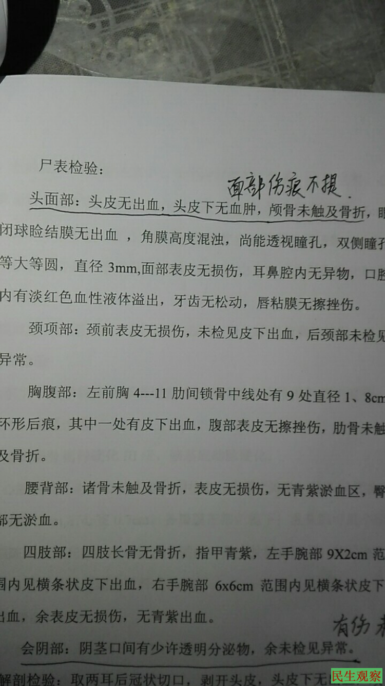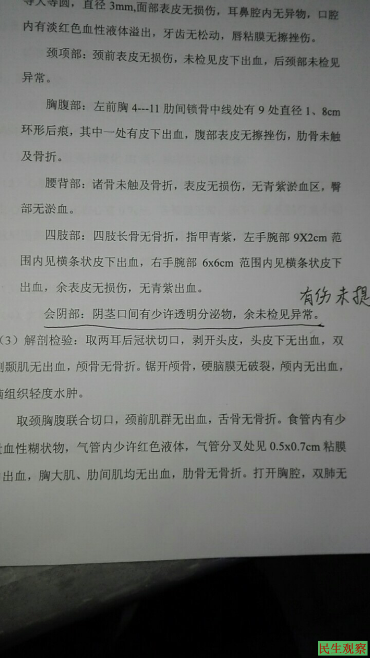 ②指甲并无青紫,而报告却写上指甲青紫等急性死亡特征。