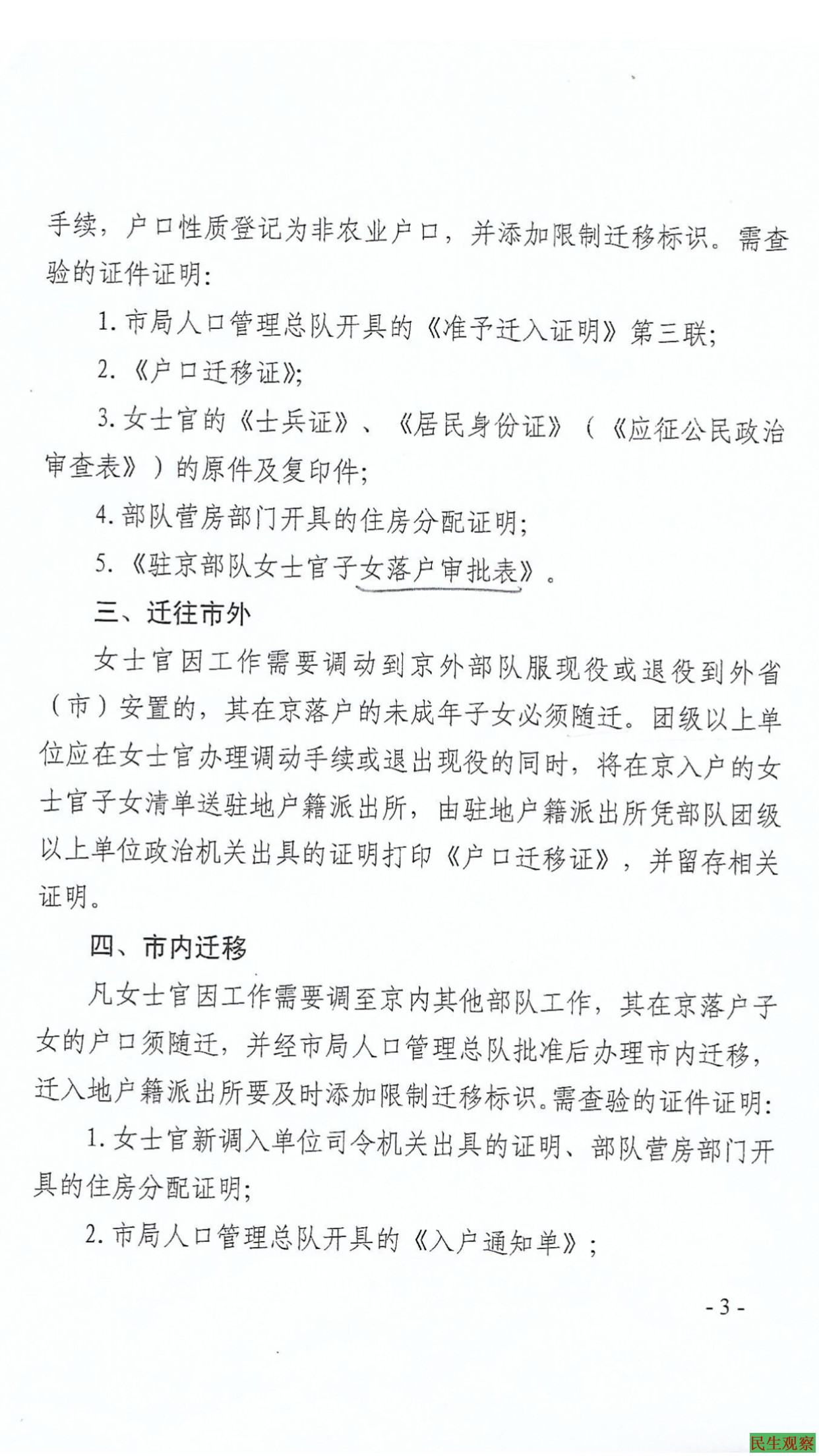 2、《北京市人口管理总队关于做好驻京部队女士官子女户口登记工作有关问题的通知》(人管办字[2014]113号)