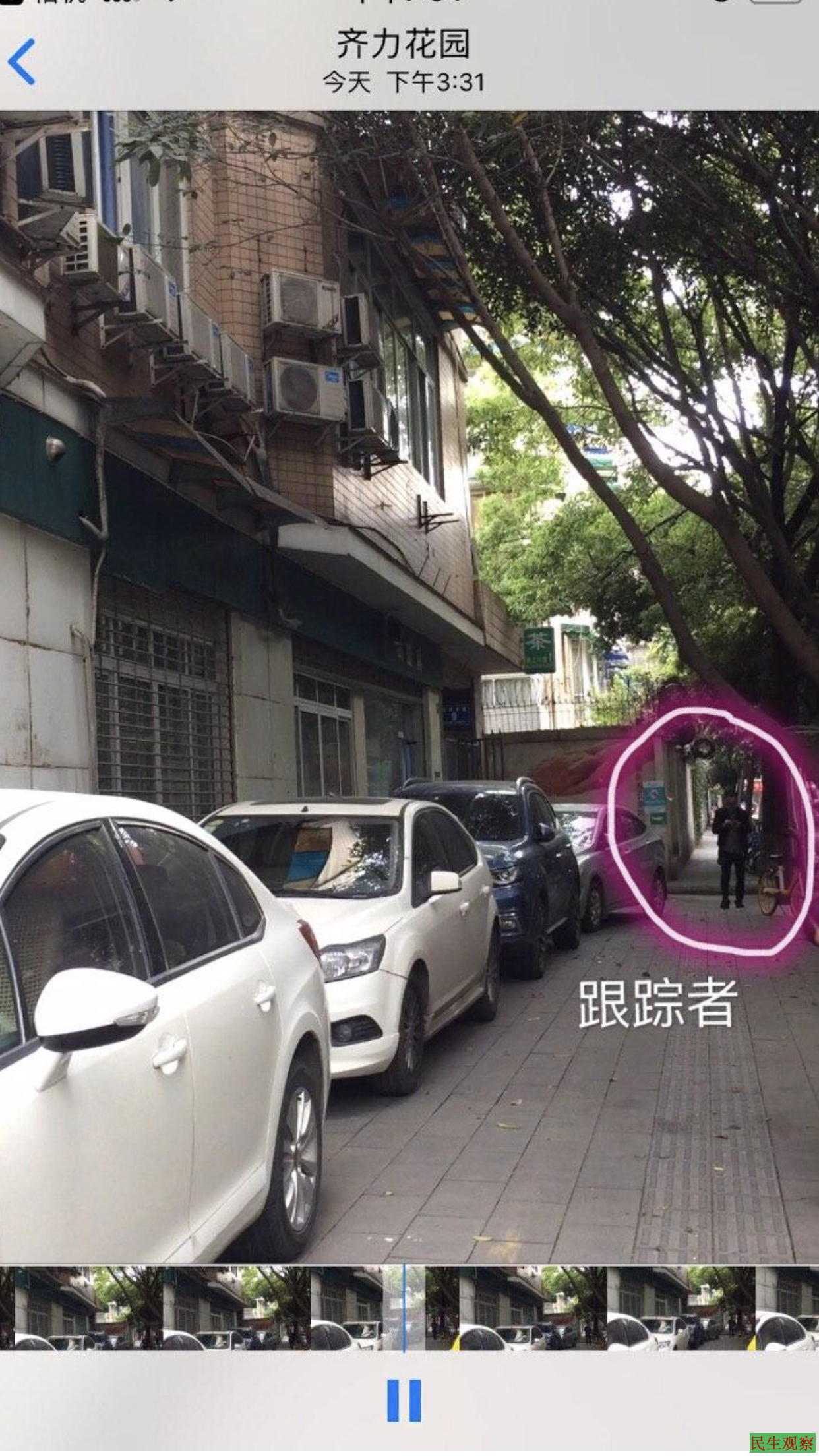 今天下午我带两娃出门,一个人远远的跟着,我就停下摄像取证,他从我身边走过去,假装路人一样往另一边走,和那个方向骑着派出所公务自行车的叶乃斌包抄过来,看着我扬起手机,准备再次拨打110,两个人就鬼鬼祟祟,离我越走越远了。