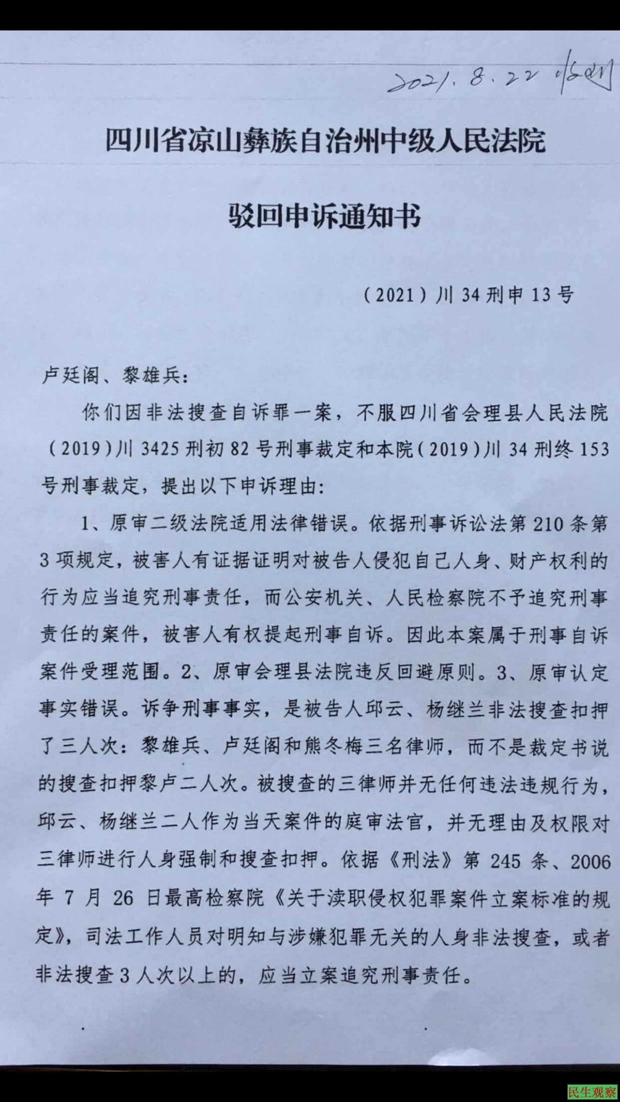 (2021年8月22日)今天下午,收到凉山州中院《驳回申诉通知书》,理由是我们没有证据证明杨继兰、邱云2法官非法搜查,这明显是官官相护啊!