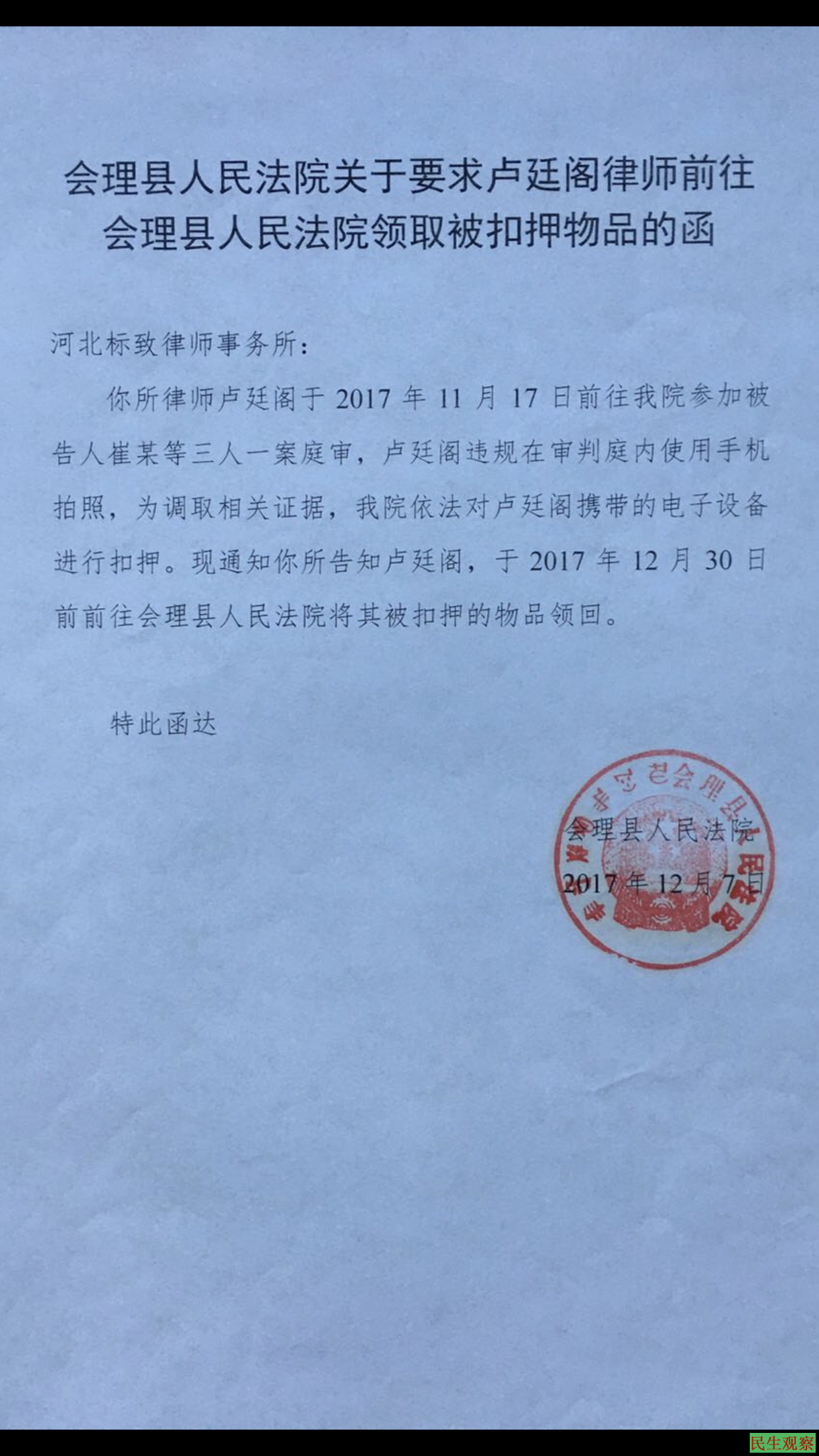 本案自诉之初,我们便申请调取搜查录像,因为我三人被搜查时,均有多人在场,多人用记录仪、专人架设摄像机录音录像。2017年12月7日,会理法院要求《领取被扣押物品的函》也是证据之一,扣押物品也是有清单和签字的,我当时领取时答应给复印,但又失信不给了。