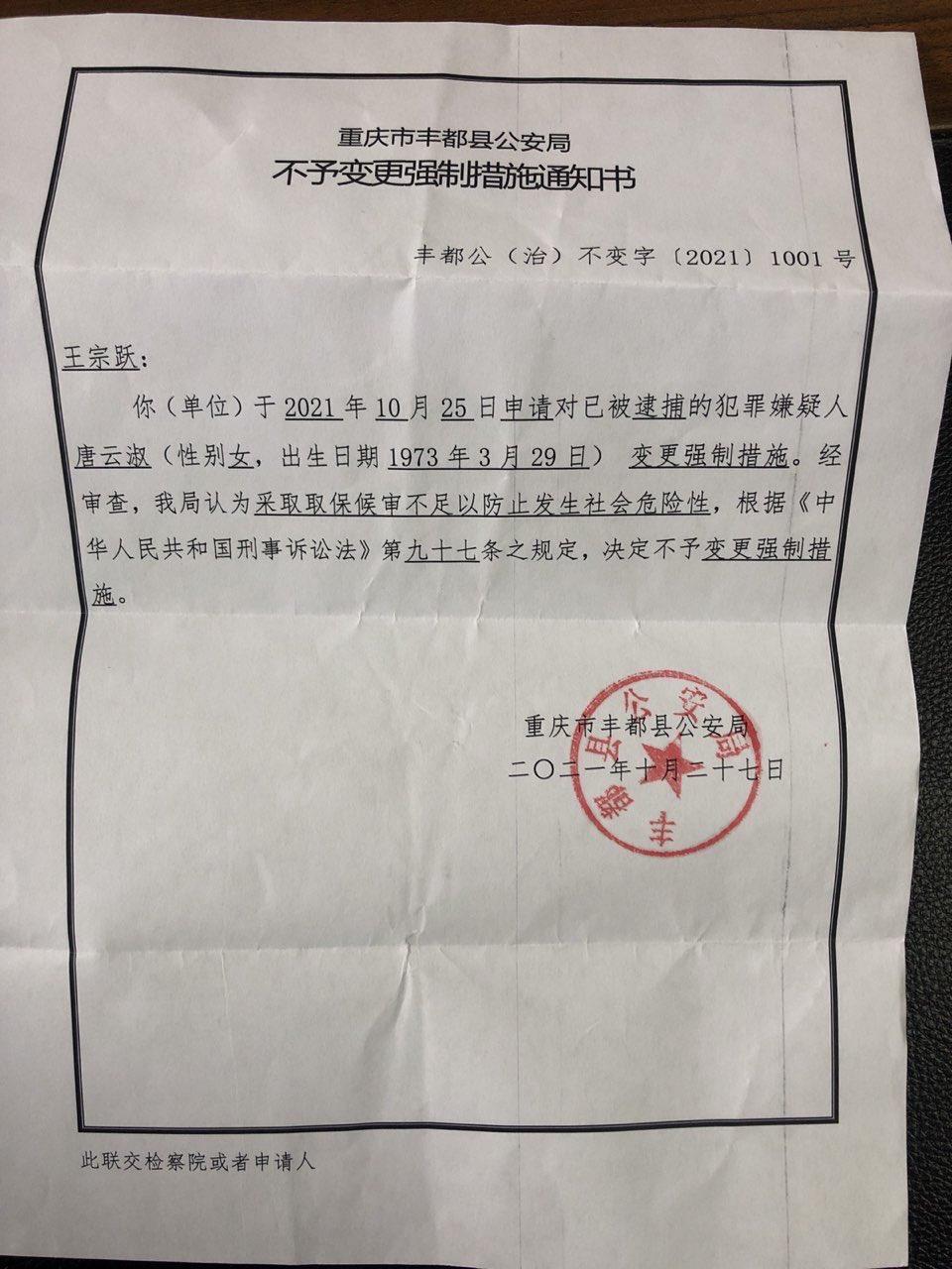 会见完毕,到丰都县公安治安大队找到大队长和承办警官,递交了委托手续和取保候审申请并依法了解唐云淑何故涉嫌寻衅滋事罪的案件情况。对取保候审申请他们称将依法答复。对唐云淑因何涉嫌寻衅滋事罪均未明确告知。