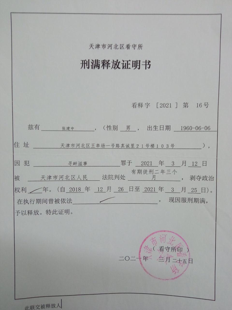 我是张建中、男、59岁,现被羁押在天津市河北区看守所。本人在2018年12月26日早上7点多,因去天津二中院围观被强迫失踪近三年的律师王全璋案开庭时,在二中院附近被河北区墙子派出所副所长杨斌、国保郭强、郎英雷等国保人员带走,后以“涉嫌寻衅滋事罪”被逮捕至今已8月有余。期间在国保等人的耐心帮助和教育下,我充分认识到了在特色社会主义制度下自己所犯下的错误和罪行。就办案机关所罗列的本人罪证做一下深刻的检讨。