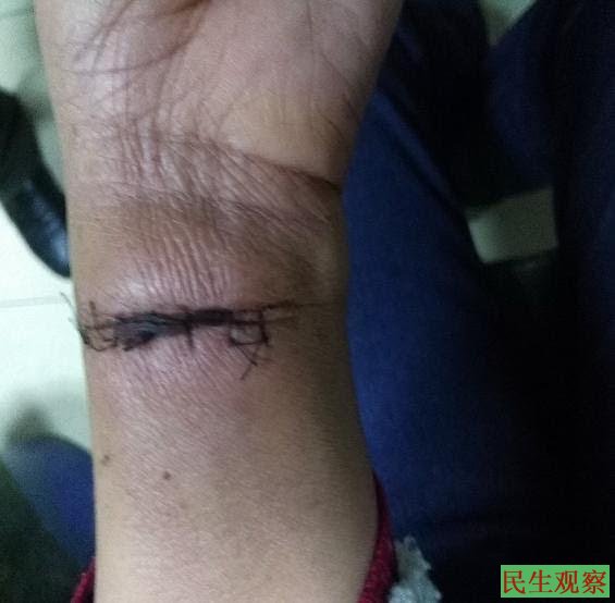 10月28日凌晨3时,我妻子到厕所垃圾筐内找到工作人员修马桶储水箱里面换下的一根铁条,拿到后她在床上被子里割腕,铁条太钝割不动。她就从自己带的包内拿出一副玻璃平光眼镜,把眼镜片掰了一半,然后割腕,血断断续续流了15分钟左右,5个监控人员就坐在距离她1米以内,床的上方有一个摄像头,摄像头在直对着自杀的现场。就在监控人员眼皮底下,在如此严密的监视网包围下,仍然发生了自杀的事件,这究竟是冷酷的听之任之还是有意为之?造成我妻子割腕自杀,遭受如此惨无人道的折磨,这是“以最残忍的方式企图谋杀”。导致慈溪协和医院发生流血恐怖自杀事件是极其无耻的犯罪行为。出事后高个子警察,马上把我妻子包里的两副眼镜都拿走,放到桌子的抽屉里,说:“等你出去还给你(注:她出来后眼镜没还)。”监视民警向王所汇报,并带我妻子去值班室叫医生治疗,5个监控人员都在。我妻子先不愿意治疗,在他们劝说下,在值班室医生给她打针,进行了手术,给肌腱、肌肉各缝了5-6针,石膏固定好后,回到126“病房”。护士来给她打了一针,之后医生也给她打过两次针。我妻子撕开石膏固定纱布后,医生重新给她包扎。从打过针后,精神更加恍惚,有时护士、保安拿药来,药都放在桌子上,他们也不说药每次吃多少颗,药没有装盒子,我妻子见药有多少颗就吃多少颗,一板放2颗她就吃2颗、一板放4颗她就吃4颗、一板放6颗她就吃6颗,最后10颗一板她也一次性吃掉,监控警察叫医生过来,医生说洗胃,她说没事,没有洗胃。监控警察说头孢吃多会拉肚子,打针吃药后,她就把自己包里的20几颗治拉肚的药全部吃掉,以为会死掉,还是没死。我妻子坐在床上用后脑勺朝墙撞,撞出两个鸡蛋大的包,监视人员叫医生过来,用冰袋敷肿起的包,包一直不退。几天没有大便,拉不下来很痛苦。置身于这个地狱实在是一种可怕的折磨,是一种人不能忍受,甚至都不能想象的痛楚。在关押期间,龙山镇派出所孙所长来126“病房”二次,王副所长来126“病房”5-6次,王副所长住医院内,他领导监控人员。