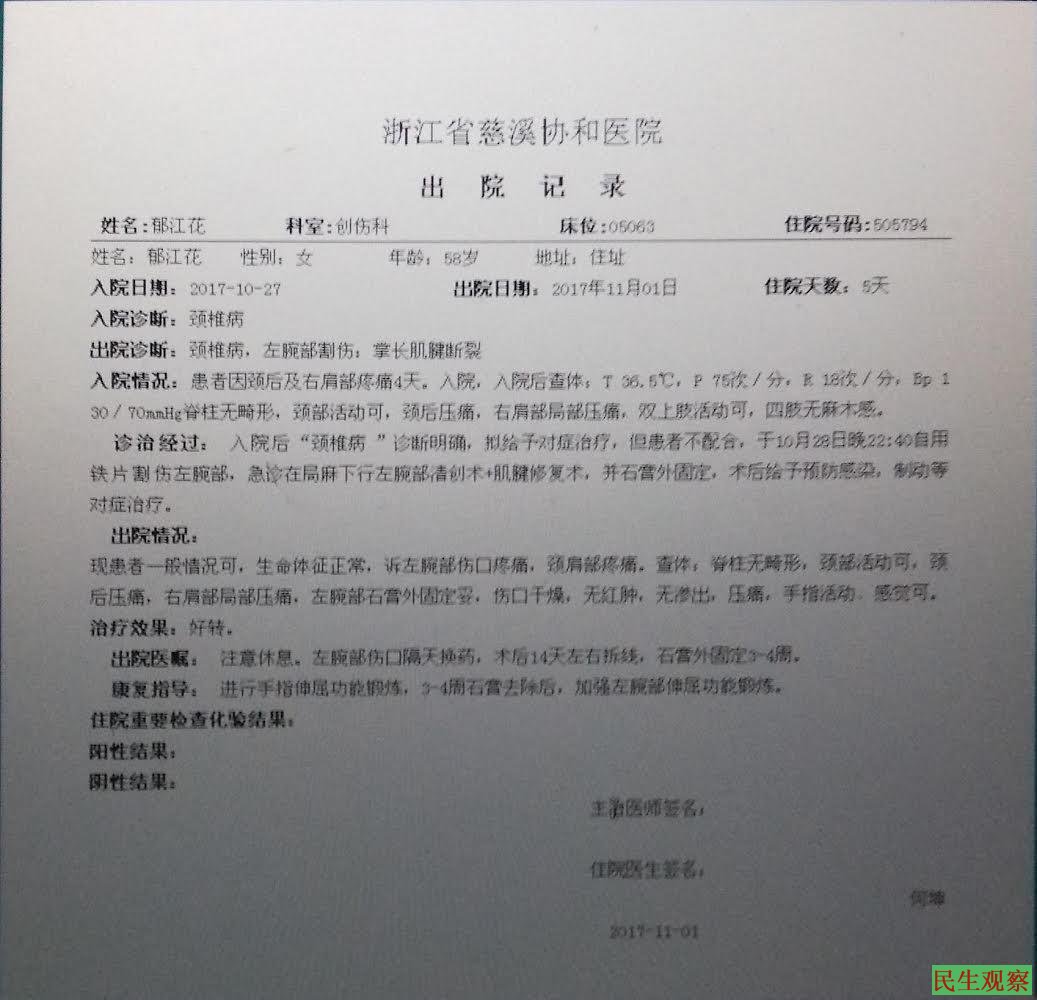 浙江省慈溪协和医院出院记录(2017年11月1日)、病人续页、门诊病历造假,科室、床位、出入院时间、入院诊断等是荒唐和肤浅的捏造,与事实不符。这是一起典型的丑闻,令人震惊!令人愤怒!医院公然制造谎言,试图把盖子捂住,他也试图控制真相,但最终他拙劣、丑陋的表演,是医院丧失了医德的呈现,责任人应被追责。事实是:2017年10月24日晚19:00左右,我妻子被押到慈溪市公安局白沙派出所,被询问后强制抬上警车,押送到慈溪协和医院公安局定点医院,时间是2017年10月25日凌晨3点左右,关押在一楼126铁栏杆“病房”内,当时我妻子没有病,强制住院、吃药、打针,这是迫害。10月28日凌晨3点多,在她睡觉的床上被子里用眼镜片割腕自杀,在医院非法关押从10月25日至10月31日下午才放人,实际上是7天,是什么原因致使医院记录上少了两天?