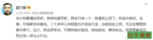 2月23日,赵兰健在微博中称遇到了麻烦。