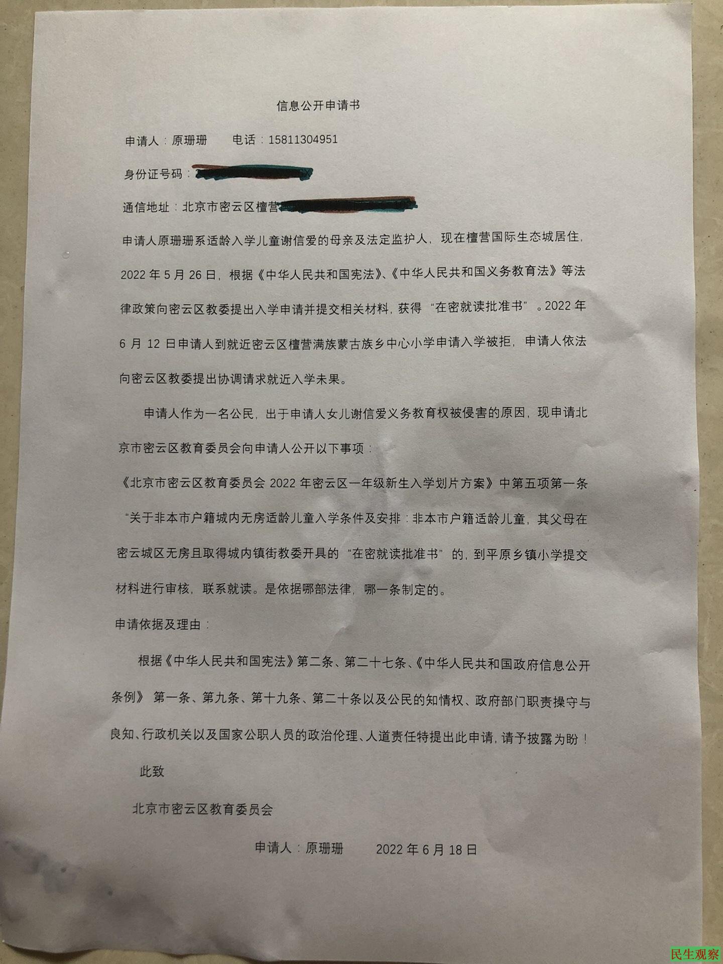 申请人原珊珊系适龄入学儿童谢信爱的母亲及法定监护人,现在檀营国际生态城居住,2022年5月26日,根据《中华人民共和国宪法》、《中华人民共和国义务教育法》等法律政策向密云区教委提出入学申请并提交相关材料,获得“在密就读批准书”。2022年6月12日申请人到就近密云区檀营满族蒙古族乡中心小学申请入学被拒,申请人依法向密云区教委提出协调请求就近入学未果。