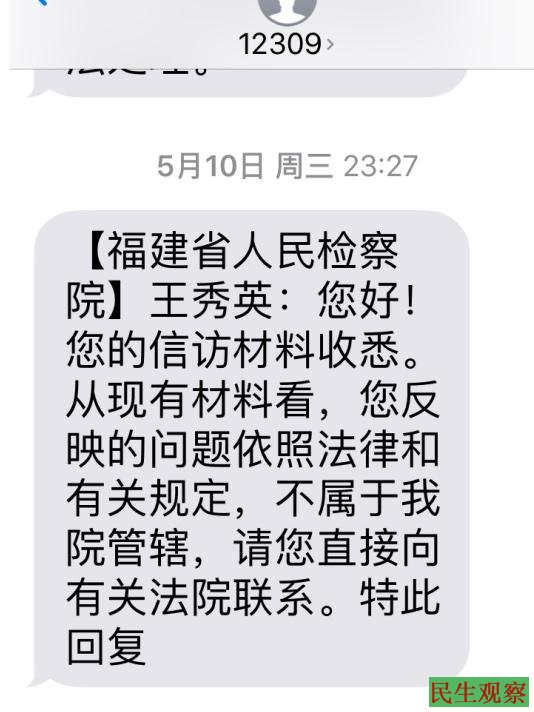 当天晚上(5月10日)23点27分收到福建省检察院12309的短信如下: