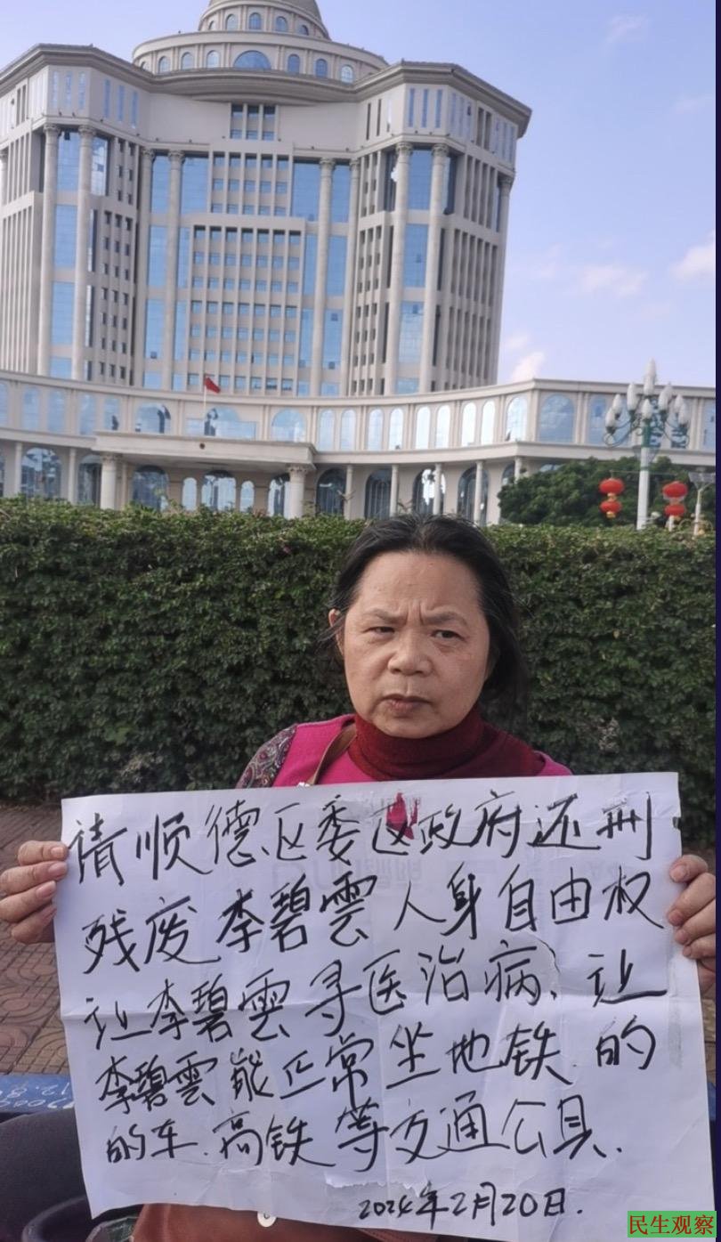 敬请省委省政府下令顺德区委区政府领导,容桂街办领导吴磊,原容桂街办书记刘国兴(现顺德区政府副主席)容里居委会村官梁敏英,蔡景薪容桂派出所等有关领导停止单一对残疾李碧云和亲人一切刁难侵害,还我人身自由权和医疗权,让我能享有坐地铁、的的汽车、高铁等交通工具的权利,让社会文明家国和谐。特向各机关部门公布!也向各界媒体,律师界、国际人权组织、女权机构、社会大众公布!请帮助李碧云!