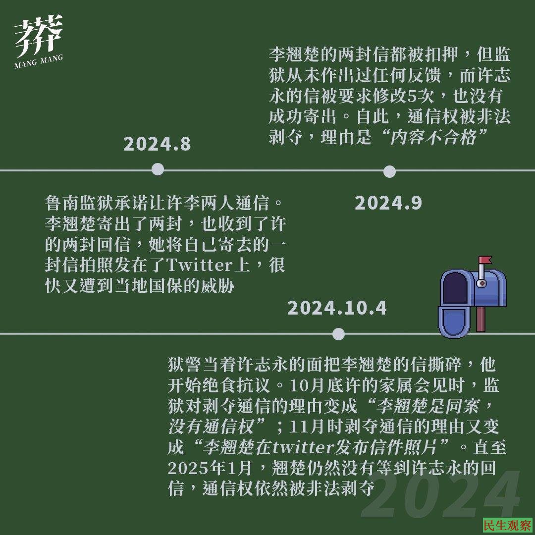 2025年1月13日,翘楚的第34个生日,也是出狱后的第一个生日。在她出狱后的这段时间,经历了许志永绝食抗争、通信权被非法剥夺以及持续的威胁和骚扰,她向朋友感叹:原来出来之后的生活比在看守所还要艰难。