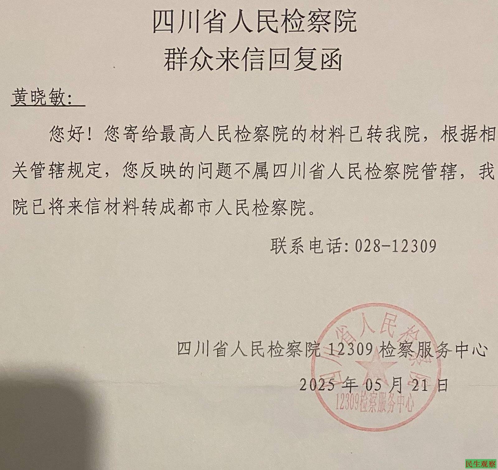 黄晓敏在锦江监狱写给成都金牛检察院的申诉信