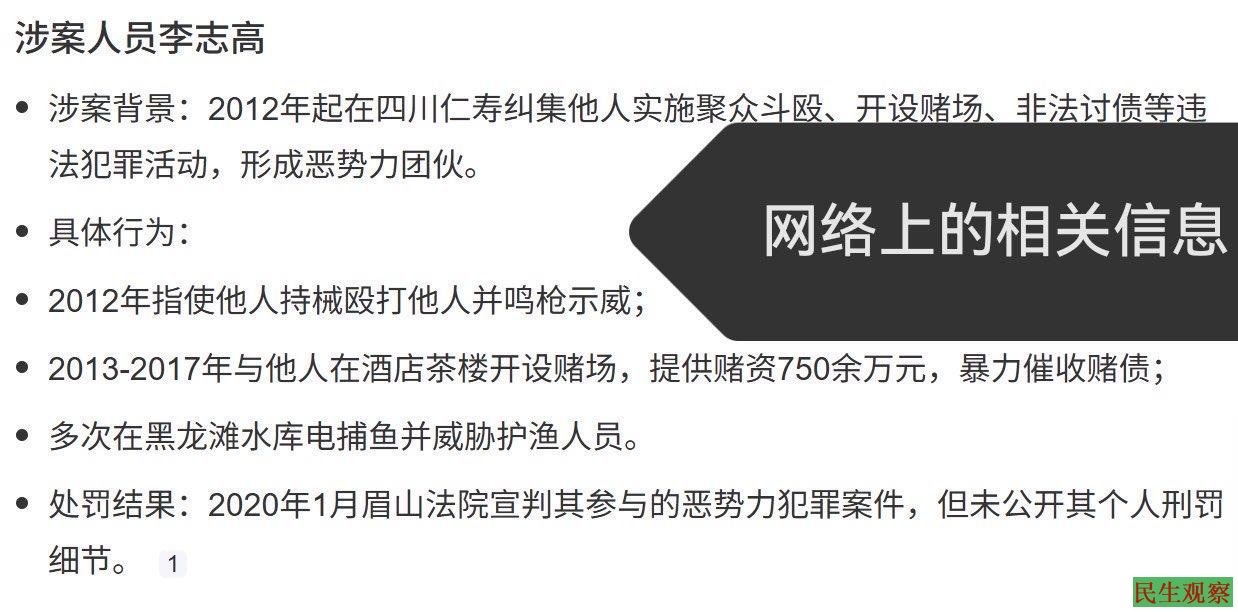2018年1月,北京最高层发起为期三年的“扫黑除恶”专项斗争,公开的重点是打击涉黑涉恶违法犯罪及其“保护伞”。根据四川省仁寿市官媒介绍“自专项斗争开展以来,政法机关与纪检监查机关双向移送问题线索32件,共‘起底’问题线索12件。办结党员干部、公职人员涉黑涉恶‘保护伞’案4件7人。全市涉黑涉恶案件12件12人。”在这组涉黑涉恶打击成果数据中,来自深圳的企业家,户籍是仁寿的李志高董事长,就是其中一人。他也是四川省开启这项专项运动后受到过重处罚的第一位。