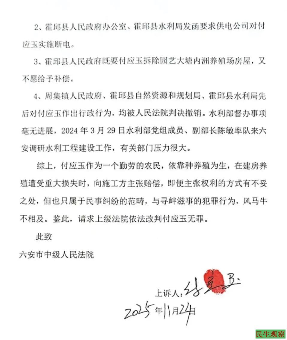 2024年,周集镇人民政府、霍邱县自然资源和规划局、霍邱县水利局先后对付应玉作出责令拆除、搬离的行政行为,后均被人民法院判决撤销。霍邱县人民政府为了协助周集镇党委、政府解决风水问题,既要付应玉拆除园艺大塘内洲养殖场房屋,又不给付应玉任何补偿。付应玉不答应,霍邱县人民政府就组织公、检、法对付应玉进行刑事构陷,付应玉不服提出上诉,从下面的判决书和上诉状上,会发现这一刑事构陷是有多么的荒唐。