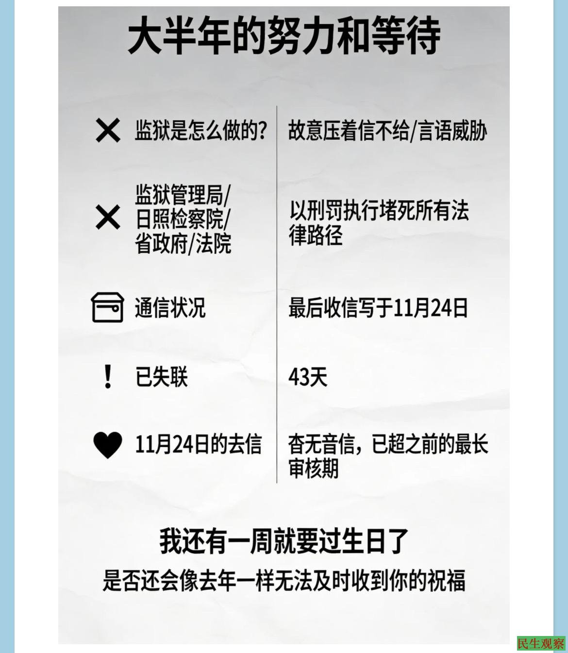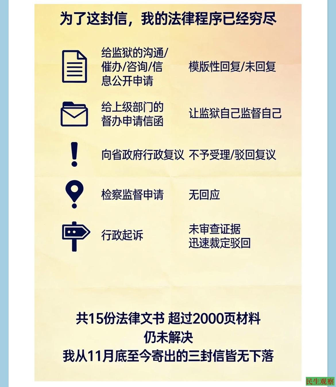 但从2025年4月到现在,大半年的时间里:监狱故意积压信件,最长的一封压了快两个月,只有在我们提交信息公开申请形成压力后才肯送达。监狱要求我修改信件,我完全照做了,监狱也签收了,却还是被扣押,理由是“未修改”。监狱从不书面告知扣押理由,从不说明法律依据,我寄了多份函件要求答复,3个月石沉大海。监狱威胁我“不要再寄法律文件”,明确表示“没用”。