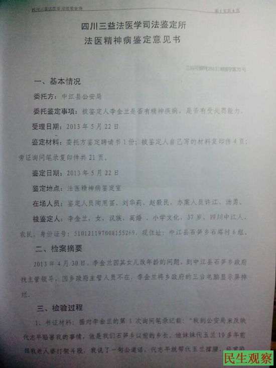 《中国精神健康与人权》月刊按,李金兰是四川省中江县石笋乡石塔村人,性格暴烈的她曾因女儿户口年龄问题在派出所内遭到铐打。2013年5月李金兰又被中江县警方骗到医院鉴定为“偏执性精神障碍”、 “被害妄想”。 这纸鉴定对李金兰来说是紧箍咒,现在依然四处上访的她随时有可能因为这纸鉴定被收进精神病院。2013年8月初,本刊志愿者蜀杰对正在成都上访的李金兰进行了面对面采访,了解了她的详细遭遇。