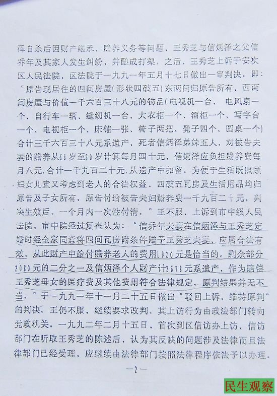 王秀芝:“95年秋天我去找过医院,让他们给我做个精神病鉴定,他们不给做。还说公安局也找他们要做精神病鉴定,也没给做。他们说我没精神病,是气的、急的。