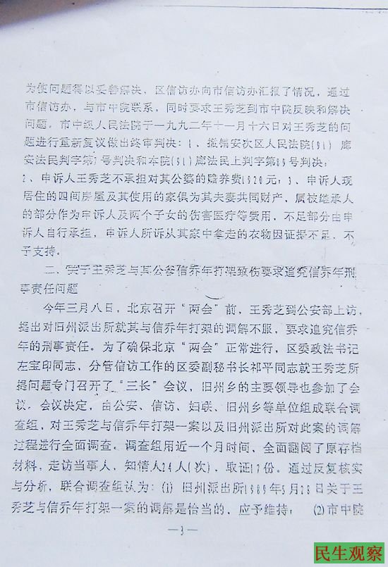 王秀芝原籍是内蒙古锡盟太仆寺旗马坊子乡吹家洼村人,1983年王秀芝的丈夫聂炳荣被自己的表弟杀害致死,由于公安局处理不当,王秀芝为避免灭门惨祸,变卖家产带着三个年幼的儿女离开原籍,与1986年远嫁河北省廊坊市广阳区(原安次区)旧州乡坎庄村。不幸母子三人又被丈夫伤害致残,财产被抢劫一空。公安局对此置之不理,王秀芝为了把凶手捉拿归案,上访20余年。在上访过程中,王秀芝多次被拘留、劳教、关精神病院,近日王秀芝向本刊记者讲述了她的悲惨遭遇,她希望更多的人关注她,为了满足她的心愿,也为了担当一份社会责任,我把她的讲述整理出来,希望能对她有所帮助。