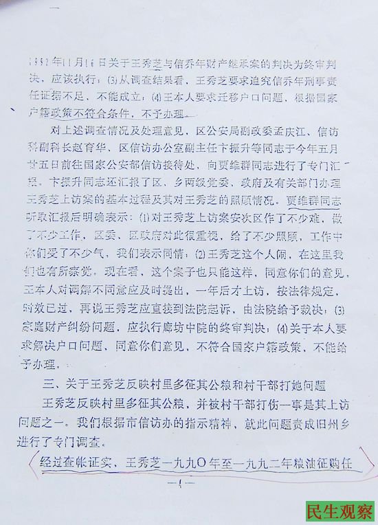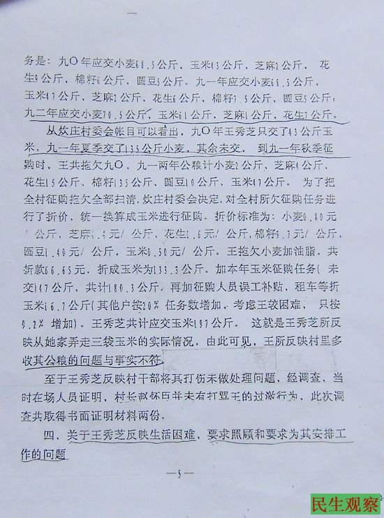 王秀芝:“我已经没有活路了,他们欺负我们孤儿寡母,我和孩子唯一的口粮被他们抢光,法院又把我家合法的私有住房强拆。他们劳教我还逼我儿子承担车费,第二次非法劳教我时把我儿和我儿的两个同学,两个拷在水泥杆上,一个关在狗笼子里,还向每人勒索5000元,不交钱就劳教,最后一共拿了6800元才了事。我的冤情象滚雪球一样越滚越大、越滚越多,谁逼我也没用,我不会做当代“杨白劳”,事情不解决不签任何协议,拼死也要寻求人间的正义和法理。”