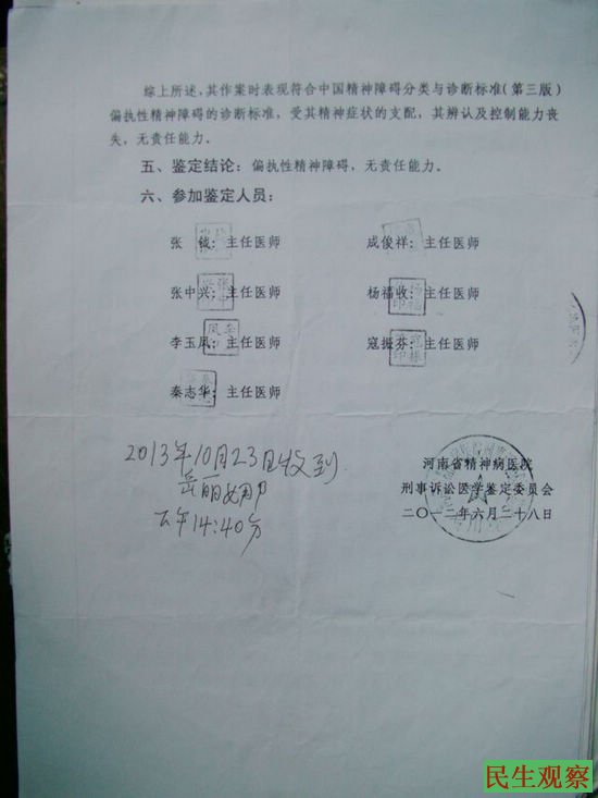 我们父女二人回家后多次找乡党委书记郭振鹏索要我们的“精神病鉴定结果”。他不但不给还恐吓说“你小心点儿不然把你们全家都关进精神病院,会有你好果子吃的”等威胁性语言,后来又说是新乡精神病院不让给我鉴定结果。后多次找人,才找到我们的鉴定书,我被鉴定为所谓的“偏执型精神障碍”,无责任能力,我父亲被鉴定为“精神分裂症”,无责任能力。