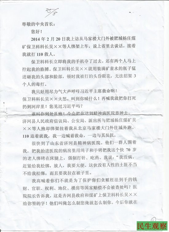 2014年2月20日,傅启英因上访再次到马家楼,杨庄煤矿保卫科吴科长等人把她绑架到停放在马家楼院内的车上,说上省里去谈话,傅启英已经被骗了好多次,担心这次回去还会遭到迫害,赶紧打110报警。吴科长一把夺了她的手机,两个人冲过来拧着她的胳膊,吴科长用矿泉水瓶子猛劲的砸傅启英的头和脸,傅启英说,我这么大年纪了招架不住他们3个人打我,一会就头晕眼花的没反抗的力气了。只好用尽力气喊习主席救命,吴科长恶狠狠的说,你见过习近平吗?再喊把你打死扔到河里,谁让你到处乱跑,今天还把你送到精神病院养神去。