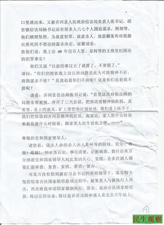 把她送到医院后她就喊,你们不就是为了保护他们贪赃枉法到手的钱财、官职不被查出来才害我的吗?你们还有没有良心?医院院长告诉她是齐河市政府和煤矿保卫科吴科长签的字把你送来的,他们让怎么治我医院就怎么治你。