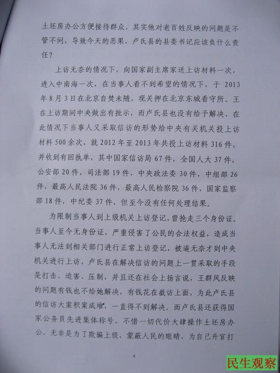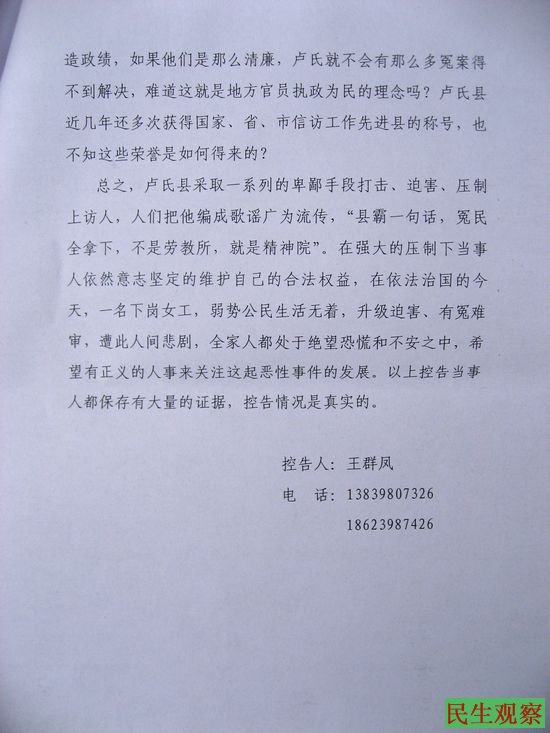 在一个法制欠缺的国家,生活在低层的百姓如果无处申冤的情况下,很多会走向极端,比如当年被强拆逼死的唐福珍。然而现实就在跟前,王群凤因上访无法获得公正的判决,曾在北京、卢氏县法院门口、三门峡市委三次自杀,而最近一次的是2013年8月3日在北京金水桥自焚未遂,因此次自焚她被关在北京东城看守所,后被判决有期徒刑11个月,在关押期间被管教要求带狗链子,这种酷刑给她手腕上留下的印现在还能看得出来。可想要把人逼到何等地步才能以这种方式献出自己的生命啊,而他们献出生命又能换来什么!!