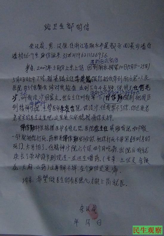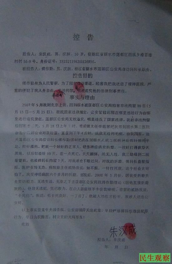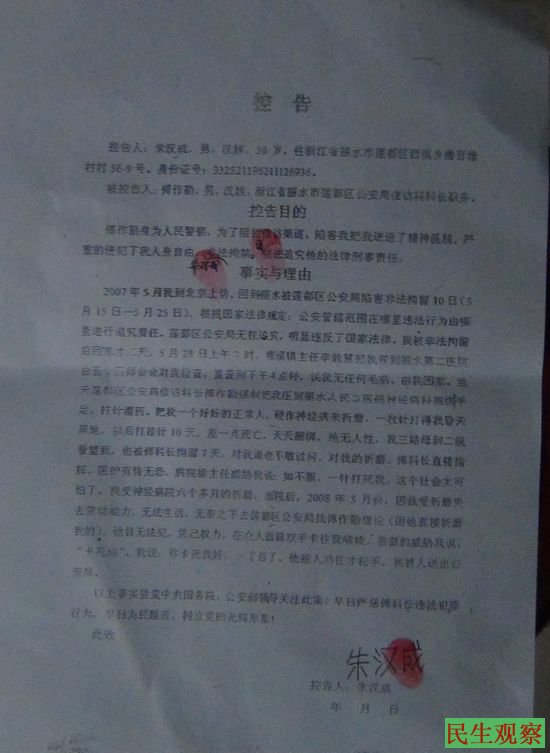 2007年5月朱汉成来北京上访,回家后被莲都区公安局非法拘留10天,5月25日获释。