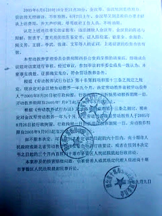 2005年8月25日,姐妹俩在北京信访被郧西县截访人员带回县里,次日到达郧西后,公安抢走了县政府办公室主任王定斌在京为姐妹俩出具的“2005年8月30日到县烟草上班”的承诺书,直接用囚车将姐妹俩送进郧西县看守所,姐妹俩被治安拘留15天;在该次治安拘留期满的2005年9月9日,姐妹俩直接转劳教1年零9个月。
