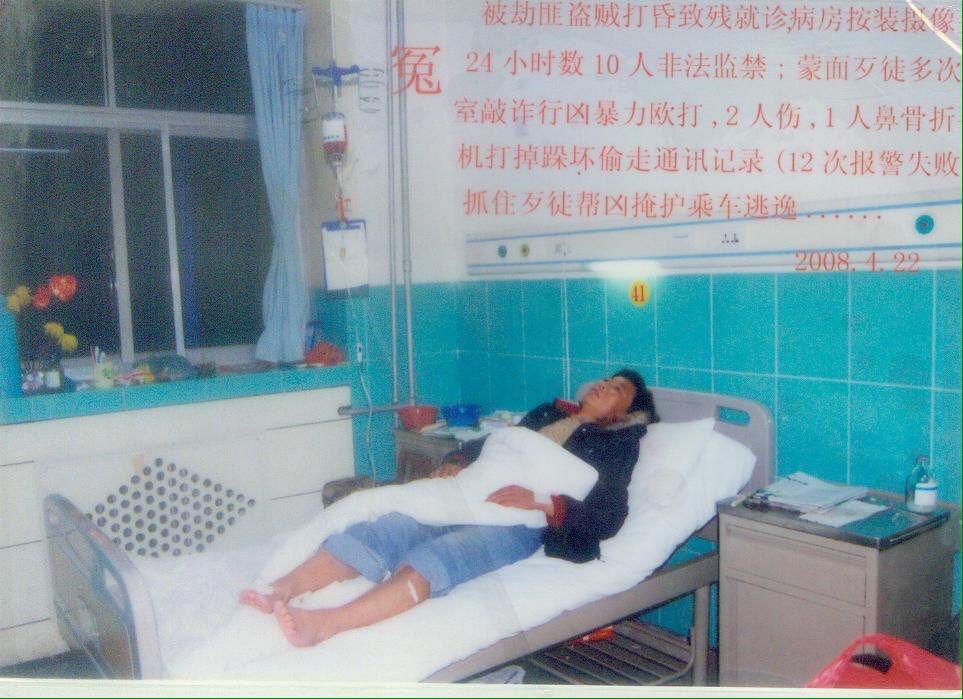 “2007年10月28日,我到镇政府找镇长要我的东西及450元钱和相关材料,在政府院内,王广甫和另一个帮凶拿着板凳和砖头砸我,揪着头发把我从三轮车上打倒后猛踢我。当时,围观的人很多,我被打的无法忍受,报了110,同去的何银斗也被他们打伤了。”