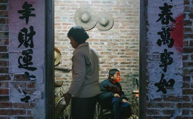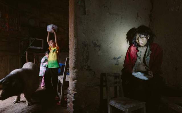9岁的小通把零食盒高高举起来,不让猪吃掉,他身边站着妹妹小灵。而他们那患有精神病的妈妈正在角落里正在吃饭,样子看起来很可怕,衣衫不整,面无表情。