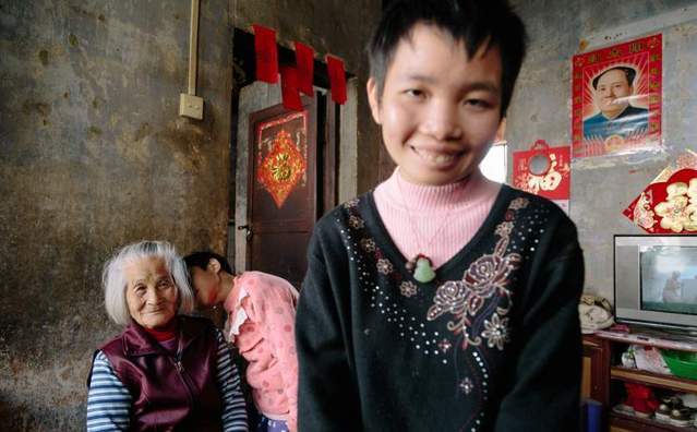图为患有精神病的两姐妹。18岁的小月站在房间的客厅里笑着,而12岁的妹妹小仪试图着去亲吻外婆林妹。林妹说,家中没有钱到医院去给两个孙女做检查,就连现在她们服用的药品也依靠当地慢性病站的免费发放,才能维持每个月的定时药物服用。