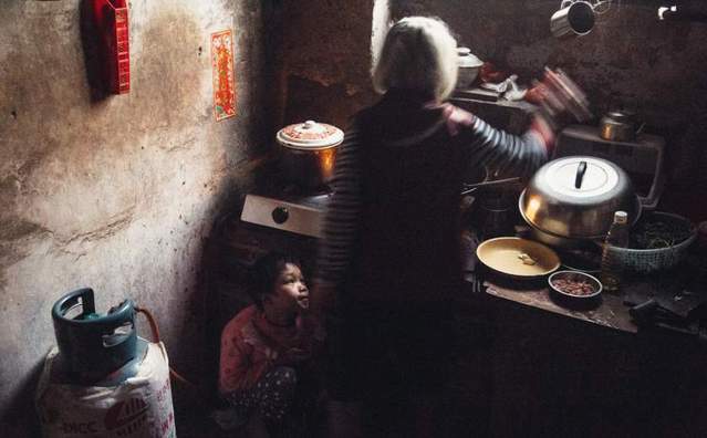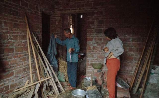 62岁的患者李秀云与她73岁的丈夫正在“客厅”房间中清理衣服。她49岁时怀孕了,家里每人每天只能赚6块钱。