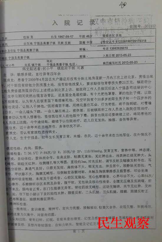 陕西王余因上访被精神病四年 现要求国家赔偿