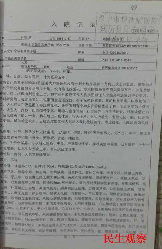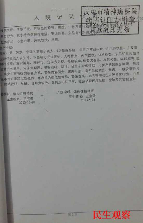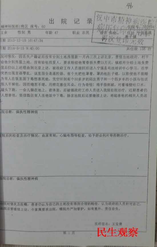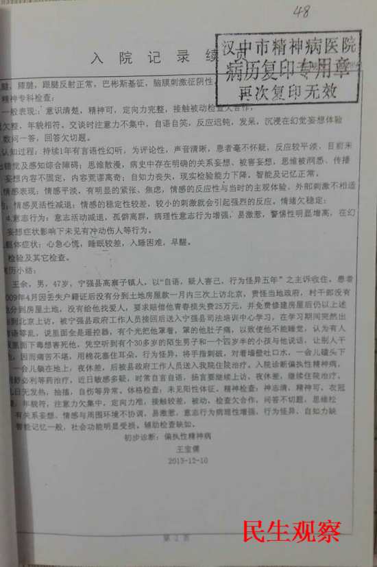 据汉中市精神病医院男病区的赵主任反映,“2010年6月,王余被镇政府送至本院。当时,镇政府认为,他们已经下发了土地补偿费,并处理解决完王余的上访问题,他仍然继续上访,加之临床诊断,镇政府和医院一致认定王余患偏执性精神病!”但院方没有提供第三方出具的支持他们说法的精神病医学鉴定。