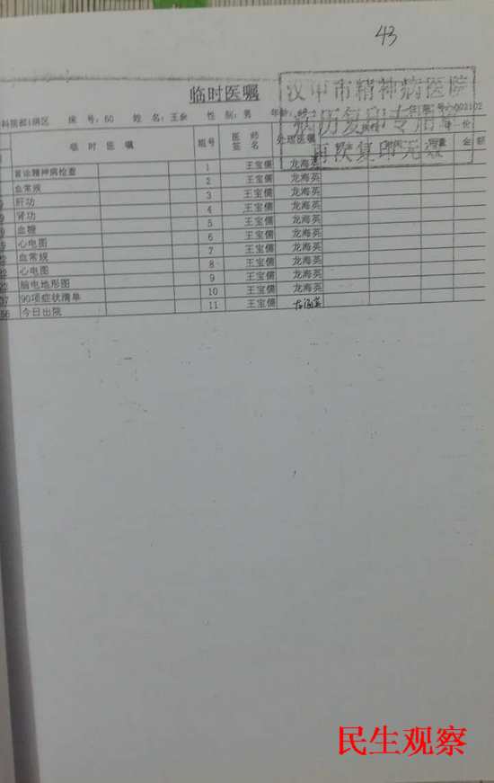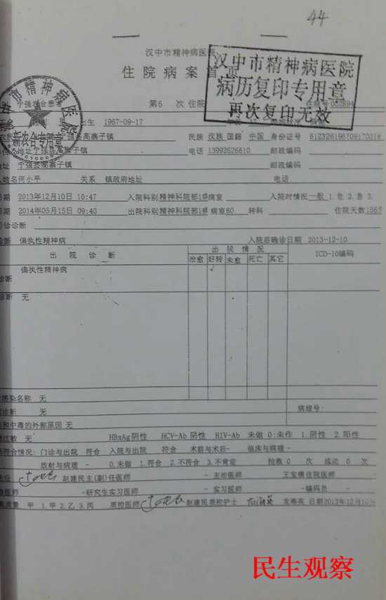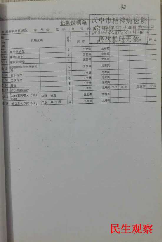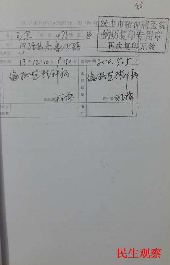 “当天我们先到医院档案室调取复制了我的病历,精神病院的院长闻讯赶来,不让我们走,指挥保安大夫抢病历,让我们还给他们不让带走,我们担心这次不能带走,他们一旦将病历毁灭,以后就复制不出来了,就就据理力争不给他们,气急败坏的医院保安一度将我们按倒在地进行抢夺!后来惊动了派出所,经过汉中律师协会在医院的律师顾问出面和吴律师协商后才得以带着病历离开。”说完到医院取证的经历,电话那头的王余微微有点气喘,不知是因为回忆当时的紧张场面还是身体虚弱。