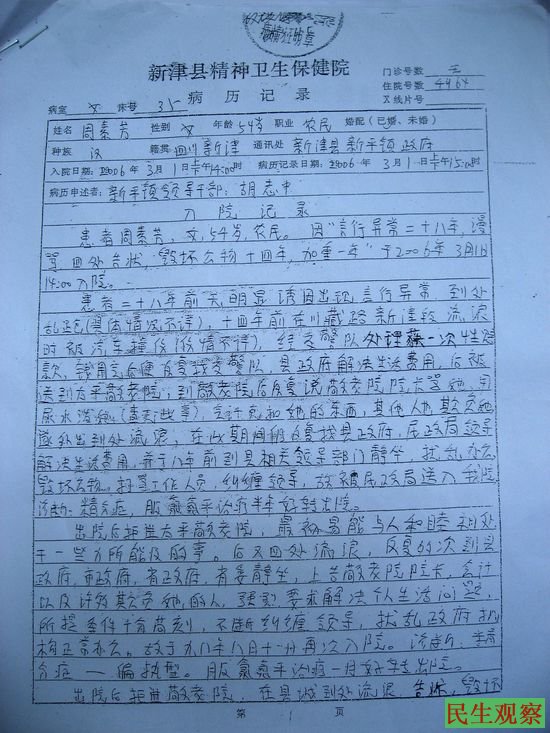 “我是一个精神完全正常的人呀,新津县政府的有关人员就这样无辜的把我说成是精神病人,对我进行打骂、进行非人道的折磨、我好冤枉啊!这么十几年弄得我四处流浪、上访,并为此借了别人那么多外债,这些都是他们不负责任的语言和野蛮的行为造成的”。周素芳一见笔者就喋喋不休的说起她的受迫害史。