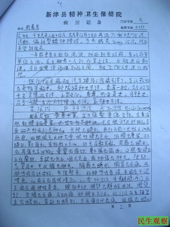 今年6月20日,为了证明自己不是精神病人,周素芳找了一个好心人借钱,到华西医科大学进行了神经功能检查,结果确诊为:交感神经功能紊乱。据医生说“这根本不是什么精神病,而是神经官能症或更年期反映的症状”。