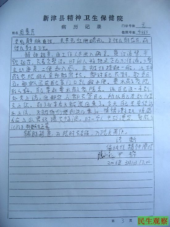 一次接一次的受迫害后,我们看到的是数字的简单重复,或许已经对这种迫害麻木了,2006年3月1日,周素芳最后一次被关精神病期间,被鉴定为偏执型精神病障碍,医生在治疗经过一栏里写着,精神异常28年,四处告状,毁物14年,加重一年入院。医护人员明确的告诉她“饭可以不吃,但是药必须吃”。周素芳说“主任张文亮、医师唐永华只管在我身上用药,从来不过问我的身体和生命,每次强行把我关进精神病院,都要把我折腾成全身浮肿、发黑才肯放我出院。并且给我用药这么多年,从来不给我住院病历和用药处方”。
