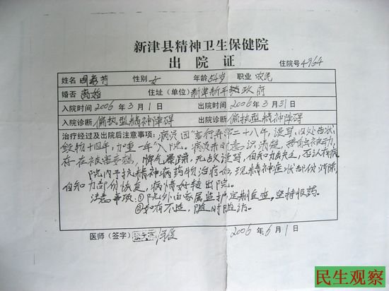 为拿一纸交通事故处理书 四川周素芳七次被关精神病院