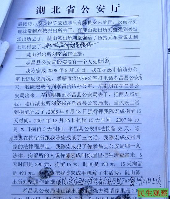 家住湖北孝感市孝昌县陡山乡七星村九组农民陈宏成,男,今年54岁。陈宏成头发几乎全白了,看上去比实际年龄老十来岁。造成过早衰老的原因,或许是日复一日的田间劳作,或许是上访八年屡遭迫害。这八年间,陈宏成曾两度被拘留、一次被劳教、二次被送精神病院,更不用说维稳人员平日对他的骚扰和恐吓。与本刊志愿者见面时,陈宏成说前一天还接到孝昌驻京办人员威吓他离开北京的电话。