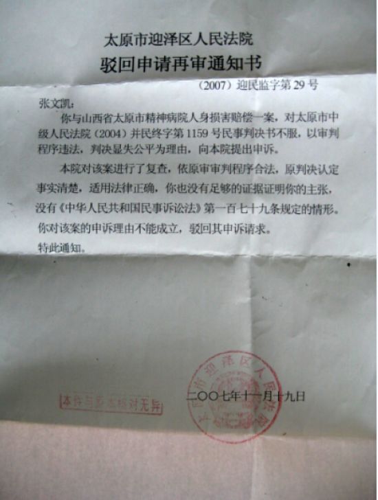 为了讨回公道,2003年张文凯起诉至太原市迎泽区人民法院,要求太原市精神病院承担没有精神病而把他当精神病治疗和他被迫跳窗逃走造成的脑外伤人身损害赔偿,并为其恢复名誉。迎泽区人民法院以超过诉讼时效、是其父送诊,跳窗逃走导致现在患小脑半球软化证据不足为由驳回了张文凯的诉讼请求。张文凯不服判决上诉到太原市中级人民法院后,太原市中级人民法院以没有充分证据证明当时跳窗逃走和现在患小脑半球软化有因果关系,故维持原判决。经过几次上诉,申诉被维持后,2014年,张文凯找到了太原市人民检察院要求监督法院依法审理,太原市检察院却以原判决并无不当为由,对张文凯的监督申请不予支持。